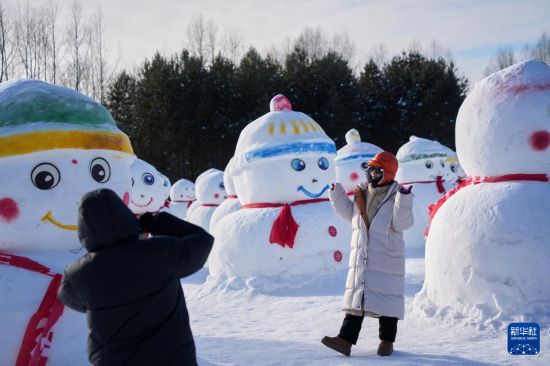 1月29日,游客在漠河北極村景區(qū)內的北極沙洲與雪人“矩陣”合影。
