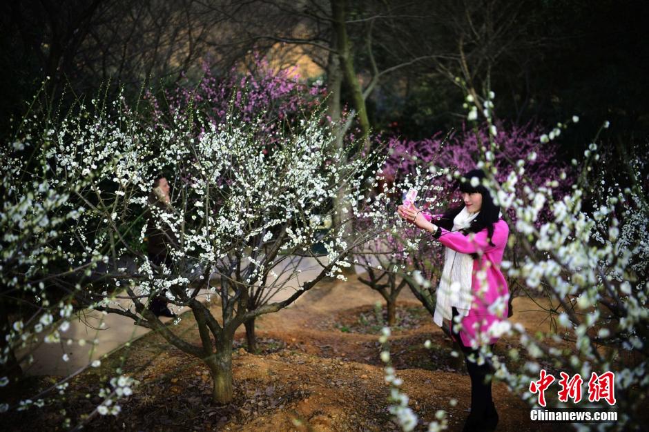 2月20日,三湘大地氣溫逐漸回升,湖南省森林植物園千株梅花競相綻放,眾多游客置身于花海中,與這難得的美景合影留念。 楊華峰 攝