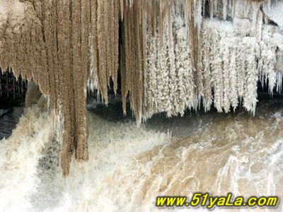 由于四季氣候和水量的差異,壺口景色也時有所變。壺口的春秋兩季,景象也甚為奇特,有氣為虹,橫浮水上,形成了“岸旁無虹掛長雨”的景觀。春回大地的時候,漫山遍野的山桃花盛開,黃河冰岸消融,水量適度平穩(wěn),主瀑、副瀑連成一片,看主瀑云霧迷蒙,望副瀑萬壑千流,觀“龍槽”如巨龍掀浪,稱為“三月桃花汛”;秋季9-11月份雨季剛過去時,河邊眾多山泉小溪,匯集大量清流,陣陣秋風(fēng)吹過,常有彩虹出現(xiàn),叫做“壺口秋風(fēng)”。明陳維藩《壺口秋風(fēng)》詩有“秋風(fēng)卷起千層浪,晚日迎來萬丈紅”句,可謂真實(shí)寫照。這兩個時期,水大而穩(wěn),瀑布寬度可達(dá)千米左右。主瀑難以接近,但遠(yuǎn)遠(yuǎn)望去,煙波浩淼,威武雄壯。大浪卷著水泡,奔騰咆哮,以翻江倒海之勢,飛流而下。壺口的冬日,又是一種奇觀:壺口兩側(cè),冰簾垂掛,晶瑩剔透,格外誘人,農(nóng)歷小雪,大雪前后,上游漂流下來的大冰塊,落入壺口平緩處,冰塊相交,冰峰凍結(jié),冰橋天然合成,人履冰橋,如走坦途,人們稱為“壺口叉橋”。在天橋村附近,積冰成橋,冰橋下激流滾滾,濤聲大作,人們稱之為“天橋”。