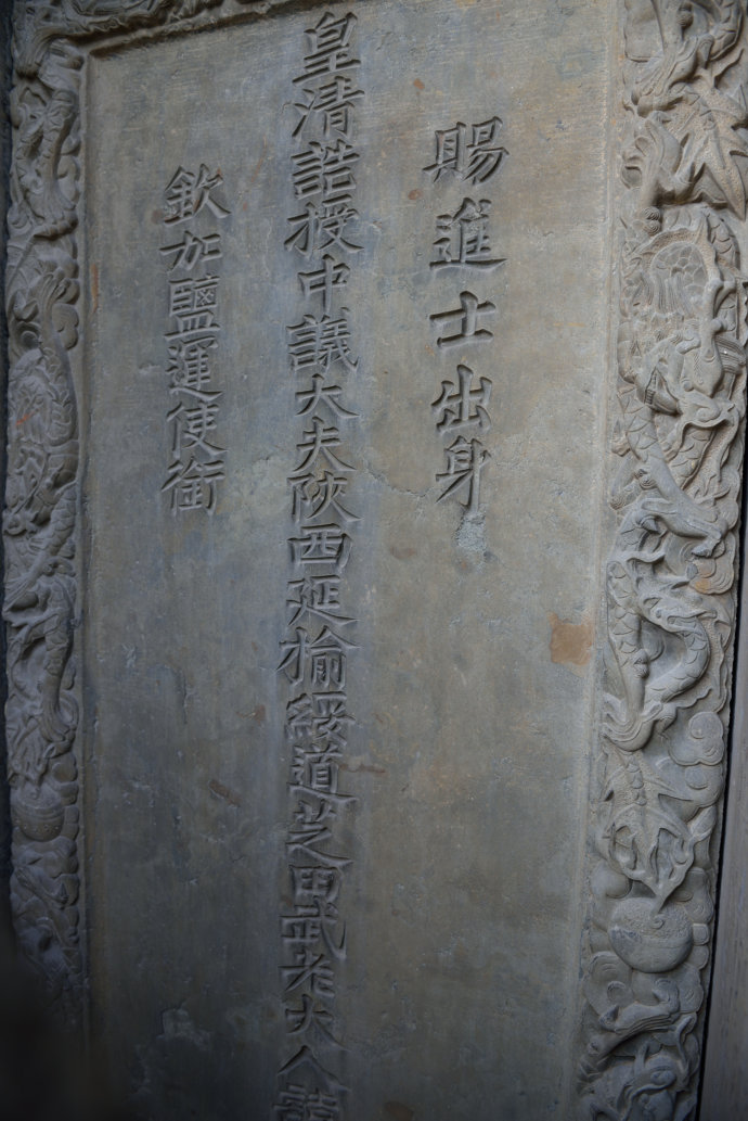 配坊實際上是一座功名石牌坊,上面刊載著武訪疇一家四代人的姓名及朝廷贈封的官爵,咸豐六年(1856)由武訪疇修建。這座石雕牌坊與其它牌坊最大的區(qū)別就是沒有題刻坊名,因此只能稱之為配坊。坐北向南,為四柱三間三樓單檐歇山頂結(jié)構(gòu),牌樓高8米,寬12米,坊體坐落在近1米高的長方形臺基上,立柱仍然采用夾柱石固定。坊頂覆蓋青瓦,正脊飾石雕貔貅裝飾,飛檐翹角,明樓檐下為“圣旨”牌,當心間設(shè)兩層小字板,第一層題刻:“贈資政大夫曾祖父廷桂,贈夫人曾祖母李氏;誥贈資政大夫祖父秉壁,誥贈夫人祖母吳氏;誥贈資政大夫父烈,誥封夫人母朱氏。陜西分巡延榆綏兵備道、加四級武訪疇謹建?!钡诙宇}刻“大清咸豐六年歲次丙辰仲夏上院榖旦”。武訪疇借建坊要弘揚祖輩陰德,而祖輩的姓氏大名又不能題刻在母親的節(jié)孝牌坊上,所以,他必須另建一坊才能完整地表達心愿。實際上,這就是建造配坊的真正目的。也正因此在配坊題刻“龍光錫寵”、“鳳詔褒榮”、“克成先志”、“重裕后昆”等。