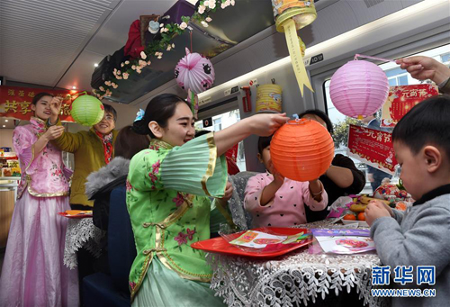 3月1日,在青島開(kāi)往北京南的G184次列車上,青島高鐵餐飲公司的工作人員和旅客一起制作花燈。新華社記者 李紫恒 攝