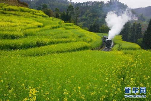 3月19日,一輛小火車從樂山市嘉陽鎮(zhèn)的油菜花田中駛過。早春時(shí)節(jié),四川省樂山市嘉陽鎮(zhèn)的油菜花競相綻放,一派春意盎然的景象。 新華社發(fā)(張偉 攝)
