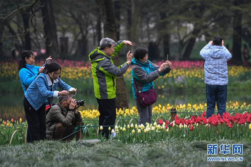 3月19日,市民和游客在太子灣公園觀賞盛開(kāi)的郁金香。近日,浙江省杭州市西子湖畔太子灣公園里的郁金香、櫻花競(jìng)相綻放,吸引大批游客和市民前來(lái)觀賞。 新華社記者 黃宗治 攝