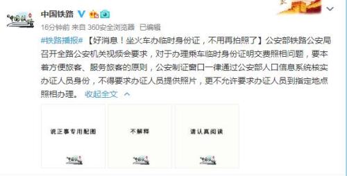 4月19日,《新華每日電訊》刊登《辦臨時(shí)身份證坐火車(chē),非得拍照證明自己是自己?》引起社會(huì)廣泛關(guān)注。公安部鐵路公安局有關(guān)負(fù)責(zé)人回應(yīng)稱,已要求所有辦證單位和人員不得再要求辦證人員提供照片。