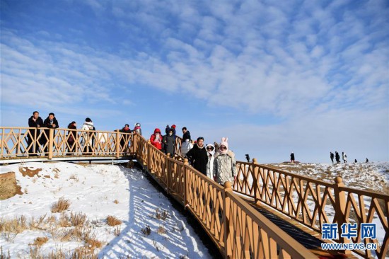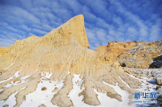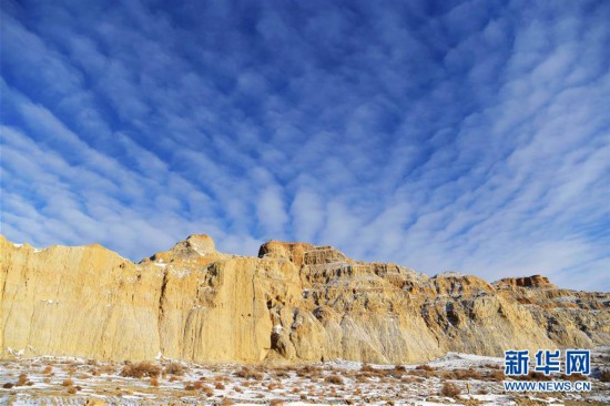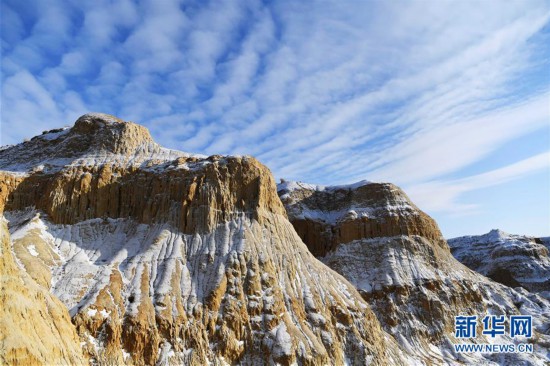 11月26日拍攝的新疆福??h烏倫古湖海上魔鬼城景區(qū)美景。 福??h烏倫古湖海上魔鬼城景區(qū)位于新疆阿勒泰地區(qū)福海縣吉力湖東岸,有著獨特的雅丹地貌和水域景觀,是當(dāng)?shù)刂穆糜蝿俚亍?新華社記者 沙達提 攝