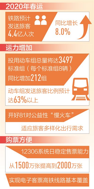 國鐵集團(tuán)相關(guān)負(fù)責(zé)人介紹,2020年鐵路春運自1月10日開始,2月18日結(jié)束,共40天,節(jié)前15天,節(jié)后25天。鐵路部門安排節(jié)前每日開行旅客列車5275對,運輸能力達(dá)到1010萬人;節(jié)后每日開行旅客列車5410對,運輸能力達(dá)到1043萬人。
