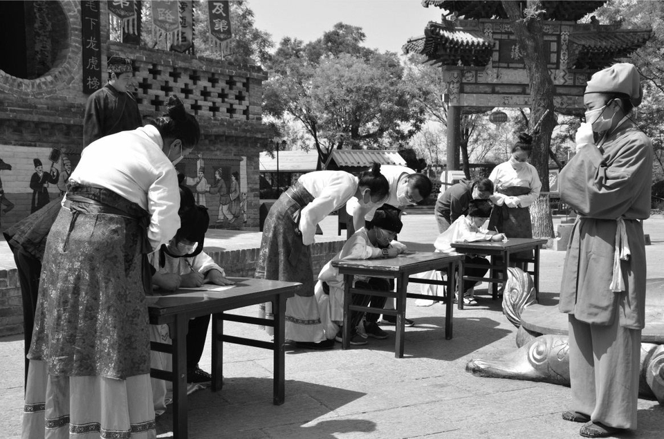 在大槐樹景區(qū)內(nèi)推出的《魁星點斗》演出中,游客正模擬參與古代筆試。 栗美霞攝