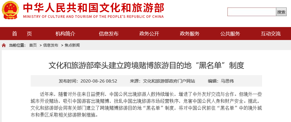 新華網(wǎng)北京8月26日電(記者 薛楓)據(jù)文化和旅游部網(wǎng)站消息,近年來(lái),隨著對(duì)外往來(lái)日益便利,中國(guó)公民出境旅游人數(shù)持續(xù)增長(zhǎng),增進(jìn)了中外友好交流與合作。但境外一些城市開設(shè)賭場(chǎng),吸引中國(guó)游客出境賭博,擾亂中國(guó)出境旅游市場(chǎng)經(jīng)營(yíng)秩序,危害中國(guó)公民人身和財(cái)產(chǎn)安全。據(jù)此,文化和旅游部會(huì)同有關(guān)部門建立了跨境賭博旅游目的地“黑名單”制度,將對(duì)中國(guó)公民前往“黑名單”中的境外城市和景區(qū)采取相關(guān)旅游限制措施。
