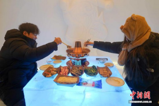 在-22℃的冰天雪地,游客體驗雪屋火鍋,感受“冰火兩重天”的極致溫差。趙宇航 攝