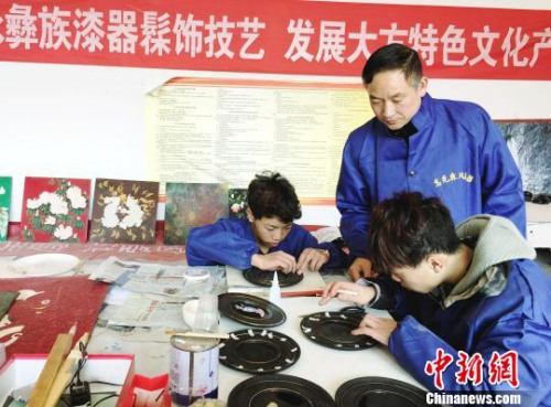 “大方彝族漆器髹飾技藝”貴州省級(jí)非遺代表性傳承人高光友指導(dǎo)學(xué)徒制作漆器。