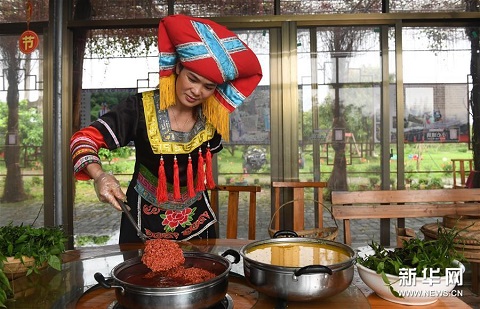3月25日,在廣西上林縣巷賢鎮(zhèn),一名壯族村民在準(zhǔn)備做五色糯米飯。新華社記者 陸波岸 攝