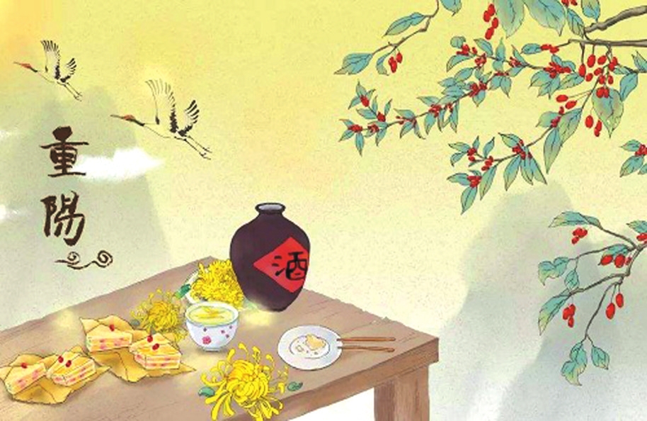 東晉詩(shī)人陶淵明在《九日閑居》一詩(shī)序文中曰:“余閑居,愛(ài)重九之名。秋菊盈園,而持醪靡由,空服九華,寄懷于言?!睂O思邈的《千金方月令》也稱(chēng):“重陽(yáng)日,必以看酒登高遠(yuǎn)眺,為時(shí)宴之游賞,以暢秋志。酒必采茱萸、菊以泛之,即醉而歸?!碧拼蹙S的詩(shī)句膾炙人口:“遙知兄弟登高處,遍插茱萸少一人。”杜牧《九日齊山登高》詩(shī)云:“塵世難逢開(kāi)口笑,菊花須插滿(mǎn)頭歸?!鼻宕本┲仃?yáng)節(jié)的習(xí)俗是把菊花枝葉貼在門(mén)窗上,“解除兇穢,以招吉祥”。