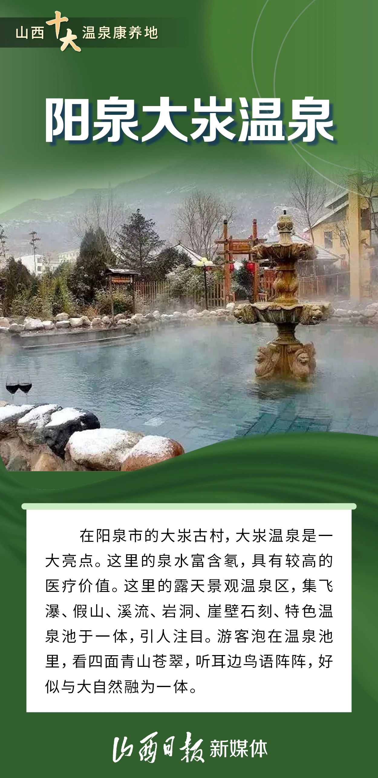寒冷的冬天里,“泡溫泉”成為康養(yǎng)旅游的首選。山西省文旅廳近日發(fā)布的“十大溫泉康養(yǎng)地”,邀請游客沐浴溫泉、洗去疲憊,感受山西冬日特色康養(yǎng)產品的魅力。