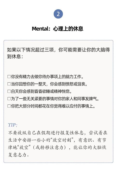 人們對于休息有不同層面的需要,休息與每一天的生活息息相關(guān)。單靠某一個(gè)具體的假期、某一種具體的活動(社交或者睡覺),并不能讓我們恢復(fù)到完全休息好了的狀態(tài)。