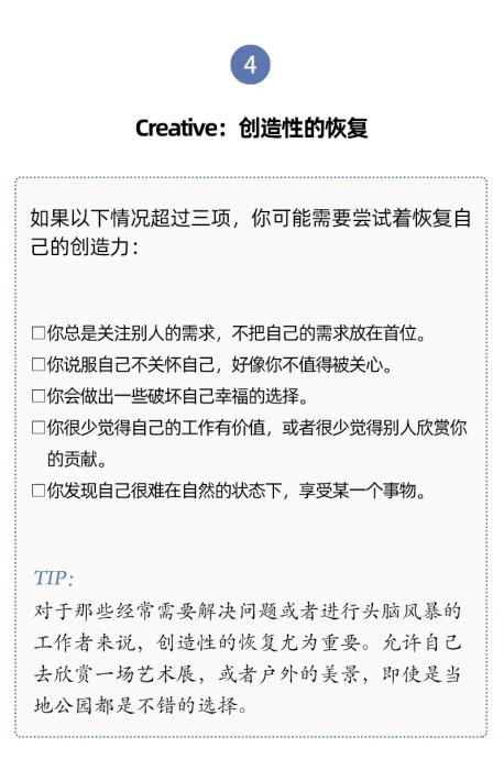 真正的休息,能夠幫助你從受外部刺激影響轉(zhuǎn)向調(diào)整自己的身體、思想和感受。當(dāng)你選擇了適合自己的休息方式,集中注意力,就會和自己聯(lián)系起來,回到當(dāng)下。