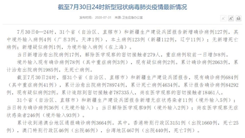 人民網(wǎng)北京7月31日電(董童)國(guó)家衛(wèi)生健康委于今日在官網(wǎng)發(fā)布的《截至7月30日24時(shí)新型冠狀病毒肺炎疫情最新情況》(以下簡(jiǎn)稱“情況”)提出,7月30日0—24時(shí),31個(gè)省(自治區(qū)、直轄市)和新疆生產(chǎn)建設(shè)兵團(tuán)報(bào)告新增確診病例127例,其中境外輸入病例4例(廣東3例,天津1例),本土病例123例(新疆112例,遼寧11例);無(wú)新增死亡病例;新增疑似病例1例,為境外輸入病例(在上海)。當(dāng)日新增治愈出院病例17例,解除醫(yī)學(xué)觀察的密切接觸者279人,重癥病例較前一日增加8例。