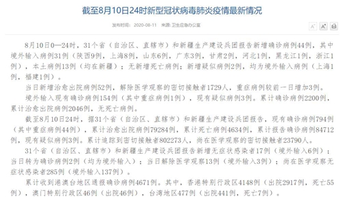 情況顯示,截至8月10日24時,據(jù)31個?。ㄗ灾螀^(qū)、直轄市)和新疆生產(chǎn)建設(shè)兵團(tuán)報告,現(xiàn)有確診病例794例(其中重癥病例44例),累計(jì)治愈出院病例79284例,累計(jì)死亡病例4634例,累計(jì)報告確診病例84712例,現(xiàn)有疑似病例3例。累計(jì)追蹤到密切接觸者802273人,尚在醫(yī)學(xué)觀察的密切接觸者23790人。