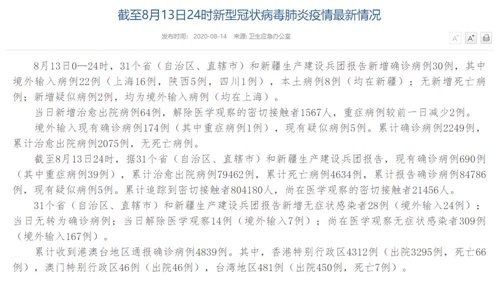 人民網(wǎng)北京8月14日電(董童)國(guó)家衛(wèi)生健康委于今日在官網(wǎng)發(fā)布的《截至8月13日24時(shí)新型冠狀病毒肺炎疫情最新情況》(以下簡(jiǎn)稱(chēng)“情況”)提出,8月13日0—24時(shí),31個(gè)?。ㄗ灾螀^(qū)、直轄市)和新疆生產(chǎn)建設(shè)兵團(tuán)報(bào)告新增確診病例30例,其中境外輸入病例22例(上海16例,陜西5例,四川1例),本土病例8例(均在新疆);無(wú)新增死亡病例;新增疑似病例2例,均為境外輸入病例(均在上海)。當(dāng)日新增治愈出院病例64例,解除醫(yī)學(xué)觀(guān)察的密切接觸者1567人,重癥病例較前一日減少2例。