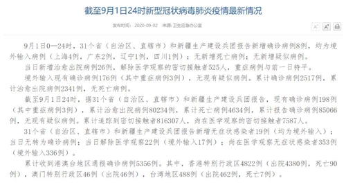 截至9月1日24時(shí),據(jù)31個(gè)?。ㄗ灾螀^(qū)、直轄市)和新疆生產(chǎn)建設(shè)兵團(tuán)報(bào)告,現(xiàn)有確診病例198例(其中重癥病例3例),累計(jì)治愈出院病例80234例,累計(jì)死亡病例4634例,累計(jì)報(bào)告確診病例85066例,無(wú)現(xiàn)有疑似病例。累計(jì)追蹤到密切接觸者816307人,尚在醫(yī)學(xué)觀察的密切接觸者7587人。