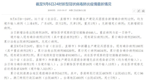 情況顯示,截至9月6日24時,據(jù)31個?。ㄗ灾螀^(qū)、直轄市)和新疆生產(chǎn)建設(shè)兵團(tuán)報告,現(xiàn)有確診病例180例(其中重癥病例2例),累計治愈出院病例80320例,累計死亡病例4634例,累計報告確診病例85134例,現(xiàn)有疑似病例1例。累計追蹤到密切接觸者819075人,尚在醫(yī)學(xué)觀察的密切接觸者5959人。