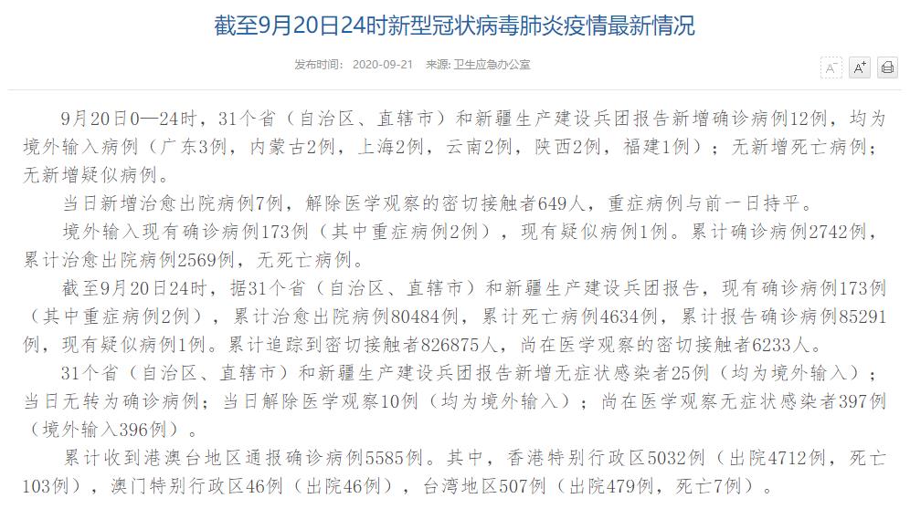 情況顯示,截至9月20日24時(shí),據(jù)31個(gè)?。ㄗ灾螀^(qū)、直轄市)和新疆生產(chǎn)建設(shè)兵團(tuán)報(bào)告,現(xiàn)有確診病例173例(其中重癥病例2例),累計(jì)治愈出院病例80484例,累計(jì)死亡病例4634例,累計(jì)報(bào)告確診病例85291例,現(xiàn)有疑似病例1例。累計(jì)追蹤到密切接觸者826875人,尚在醫(yī)學(xué)觀察的密切接觸者6233人。