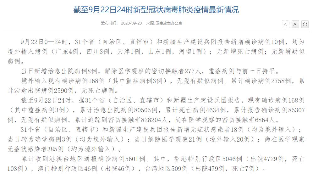 人民網(wǎng)北京9月23日電(董童)國家衛(wèi)生健康委于今日在官網(wǎng)發(fā)布的《截至9月22日24時新型冠狀病毒肺炎疫情最新情況》(以下簡稱“情況”)提出,9月22日0—24時,31個?。ㄗ灾螀^(qū)、直轄市)和新疆生產(chǎn)建設(shè)兵團報告新增確診病例10例,均為境外輸入病例(廣東4例,四川3例,天津1例,山東1例,河南1例);無新增死亡病例;無新增疑似病例。當日新增治愈出院病例8例,解除醫(yī)學(xué)觀察的密切接觸者277人,重癥病例與前一日持平。