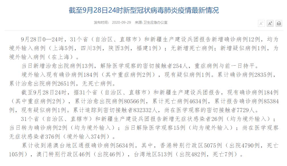 情況顯示,截至9月28日24時,據(jù)31個?。ㄗ灾螀^(qū)、直轄市)和新疆生產(chǎn)建設(shè)兵團報告,現(xiàn)有確診病例184例(其中重癥病例2例),累計治愈出院病例80566例,累計死亡病例4634例,累計報告確診病例85384例,現(xiàn)有疑似病例1例。累計追蹤到密切接觸者832332人,尚在醫(yī)學(xué)觀察的密切接觸者7729人。