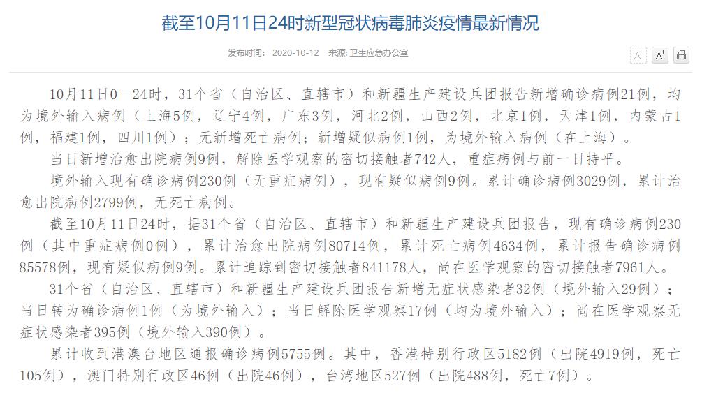 人民網(wǎng)北京10月12日電(董童)國家衛(wèi)生健康委于今日在官網(wǎng)發(fā)布的《截至10月11日24時新型冠狀病毒肺炎疫情最新情況》(以下簡稱“情況”)提出,10月11日0—24時,31個?。ㄗ灾螀^(qū)、直轄市)和新疆生產(chǎn)建設(shè)兵團報告新增確診病例21例,均為境外輸入病例(上海5例,遼寧4例,廣東3例,河北2例,山西2例,北京1例,天津1例,內(nèi)蒙古1例,福建1例,四川1例);無新增死亡病例;新增疑似病例1例,為境外輸入病例(在上海)。當日新增治愈出院病例9例,解除醫(yī)學(xué)觀察的密切接觸者742人,重癥病例與前一日持平。