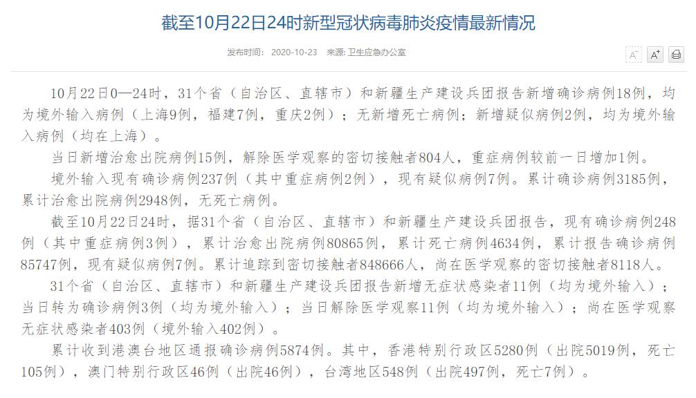 人民網(wǎng)北京10月23日電(董童)國家衛(wèi)生健康委于今日在官網(wǎng)發(fā)布的《截至10月22日24時新型冠狀病毒肺炎疫情最新情況》(以下簡稱“情況”)提出,10月22日0—24時,31個?。ㄗ灾螀^(qū)、直轄市)和新疆生產(chǎn)建設兵團報告新增確診病例18例,均為境外輸入病例(上海9例,福建7例,重慶2例);無新增死亡病例;新增疑似病例2例,均為境外輸入病例(均在上海)。當日新增治愈出院病例15例,解除醫(yī)學觀察的密切接觸者804人,重癥病例較前一日增加1例。