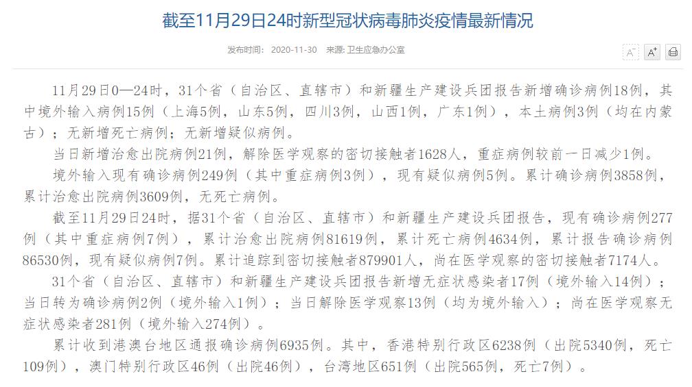 人民網(wǎng)北京11月30日電(董童)國(guó)家衛(wèi)生健康委于今日在官網(wǎng)發(fā)布的《截至11月29日24時(shí)新型冠狀病毒肺炎疫情最新情況》(以下簡(jiǎn)稱“情況”)指出,11月29日0—24時(shí),31個(gè)?。ㄗ灾螀^(qū)、直轄市)和新疆生產(chǎn)建設(shè)兵團(tuán)報(bào)告新增確診病例18例,其中境外輸入病例15例(上海5例,山東5例,四川3例,山西1例,廣東1例),本土病例3例(均在內(nèi)蒙古);無新增死亡病例;無新增疑似病例。當(dāng)日新增治愈出院病例21例,解除醫(yī)學(xué)觀察的密切接觸者1628人,重癥病例較前一日減少1例。