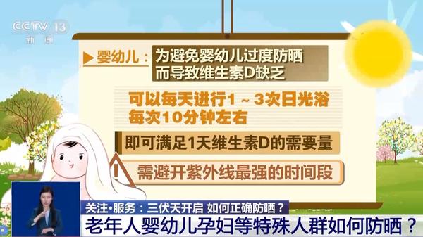 嬰幼兒:為了避免嬰幼兒過度防曬而導致維生素D缺乏,可以每天進行1至3次日光浴,每次10分鐘左右,即可滿足1天維生素D的需要量,但需避開紫外線最強的時間段。小于6個月的嬰兒不建議使用防曬產(chǎn)品,大于6個月的嬰幼兒建議以“硬防曬”為主。即使涂抹了防曬產(chǎn)品,也不宜在強烈陽光下活動。