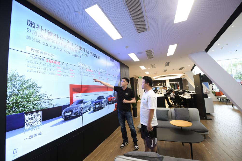9月24日,在位于浙江省湖州市湖東街道的奧迪銷售門店,工作人員向顧客介紹以舊換新補貼政策。新華社記者 翁忻旸 攝