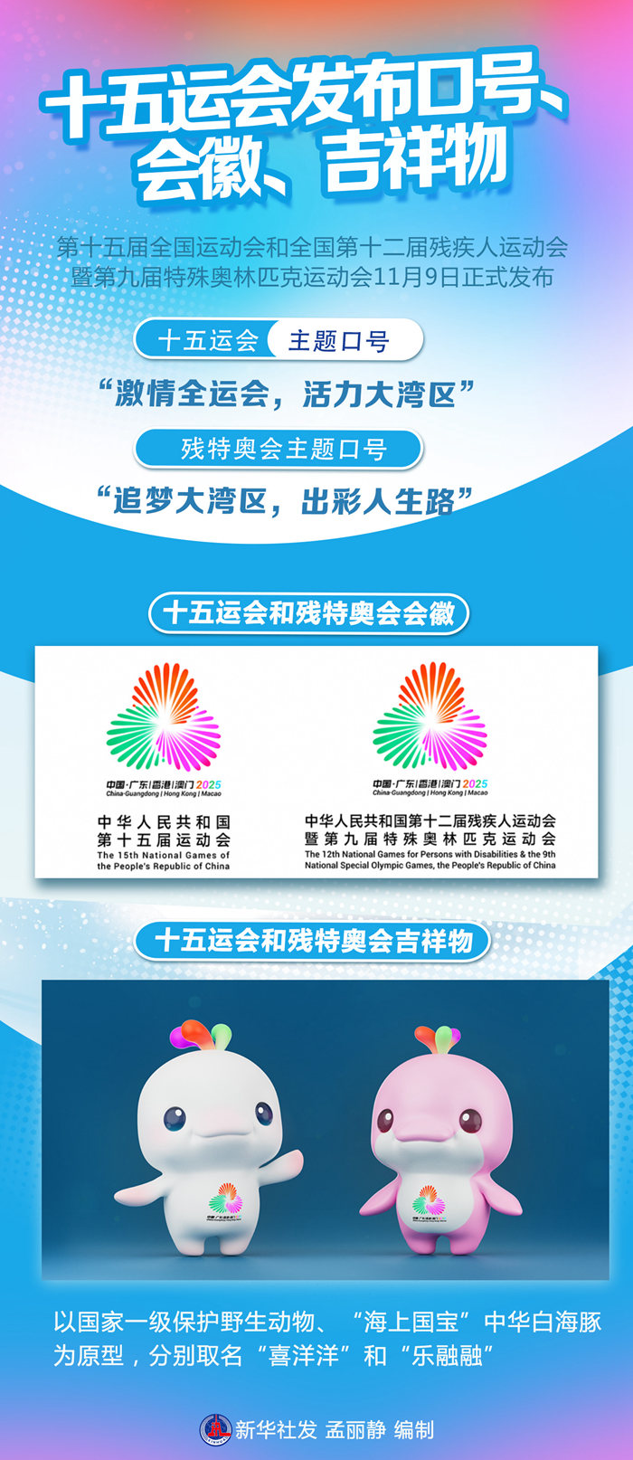 十五運(yùn)會和殘?zhí)貖W會吉祥物以國家一級保護(hù)野生動(dòng)物、“海上國寶”中華白海豚為原型,分別取名“喜洋洋”和“樂融融”,寓意喜氣洋洋、其樂融融、團(tuán)圓和美。