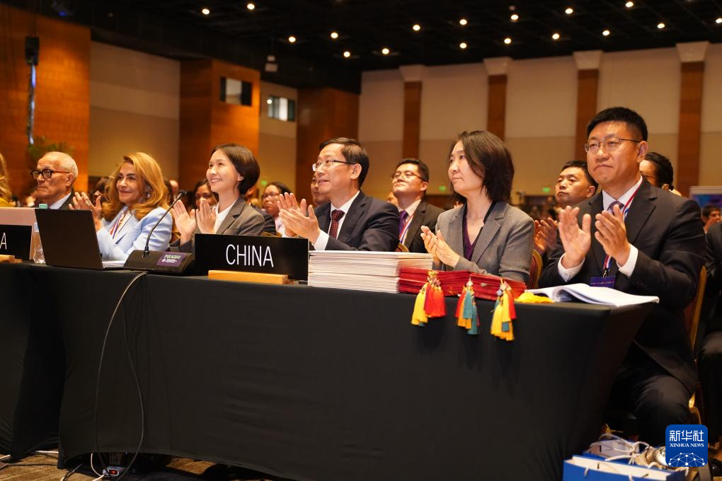 12月4日,在巴拉圭亞松森拍攝的聯(lián)合國教科文組織保護非物質(zhì)文化遺產(chǎn)政府間委員會第19屆常會評審現(xiàn)場,中國代表團慶祝春節(jié)申遺成功。新華社記者 朱雨博 攝
