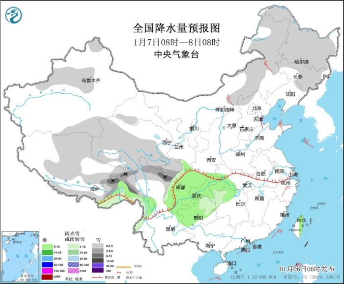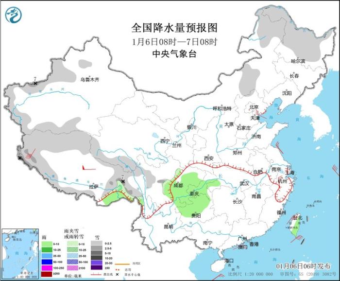 據(jù)中央氣象臺網(wǎng)站消息,昨日,全國大部地區(qū)降水稀少,內(nèi)蒙古、吉林等地部分地區(qū)出現(xiàn)降雪;內(nèi)蒙古、山西、京津冀等地風(fēng)力較大。預(yù)計未來三天,冷空氣影響我國大部地區(qū),新疆北部、青藏高原有降雪,西南地區(qū)東部、江南西部等地部分地區(qū)有雨轉(zhuǎn)雪,關(guān)注對交通出行等的影響。 冷空氣將影響我國大部地區(qū) 西南地區(qū)和江南西部有雨雪天氣 受冷空氣影響,6日夜間至9日,西南地區(qū)和中東部大部將有4~6℃降溫,東北地區(qū)、江漢、江南西部、貴州等地局地降溫8℃以上,內(nèi)蒙古中東部、華北北部、東北地區(qū)南部等地將有4~6級風(fēng);青藏高原東部、西南地區(qū)和江南西部有一次雨雪天氣過程,青海南部、西藏東部和川西高原有小到中雪,局地大雪,四川南部、云南北部、貴州中北部、重慶東部、湖北西部和湖南西部有小雨轉(zhuǎn)雨夾雪或雪,其中四川南部、云南西北部和東北部、貴州北部、湖北西南部、湖南西北部等地的部分地區(qū)有中到大雪,局地暴雪,貴州中北部、湖北西南部、湖南西部等地局地有凍雨。 國內(nèi)未來三天具體預(yù)報 1月6日08時至7日08時,內(nèi)蒙古中東部、黑龍江大部、新疆伊犁河谷和南疆盆地、西藏西部和東部、青海南部、川西高原北部、山東半島北部等地部分地區(qū)有小到中雪或雨夾雪,其中,新疆南疆西部山區(qū)、西藏西部等地部分地區(qū)有大雪,局地暴雪(10~16毫米)。西藏東南部、湖北西南部、重慶大部、貴州西北部、云南東北部、臺灣島東部等地部分地區(qū)有小雨。內(nèi)蒙古中東部、遼東半島、山東半島、浙江北部等地部分地區(qū)有4~6級風(fēng)(見圖1)。