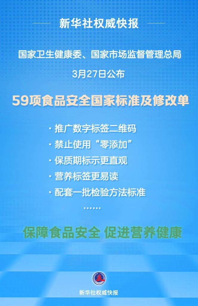 國(guó)家衛(wèi)生健康委、國(guó)家市場(chǎng)監(jiān)督管理總局27日公布59項(xiàng)食品安全國(guó)家標(biāo)準(zhǔn)及修改單。消費(fèi)者特別關(guān)心的“零添加”、食物過(guò)敏、鹽油糖標(biāo)示等內(nèi)容,均有明確規(guī)定,旨在進(jìn)一步提升食品安全保障水平,維護(hù)公眾健康,促進(jìn)食品產(chǎn)業(yè)高質(zhì)量發(fā)展。
