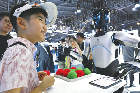 7月26日,小朋友在與機器人進行游戲互動。當(dāng)日,2025世界人工智能大會暨人工智能全球治理高級別會議在上海開幕。本屆大會以“智能時代 同球共濟”為主題,包括會議論壇、展覽展示、賽事評獎、應(yīng)用體驗、創(chuàng)新孵化等五大板塊。
