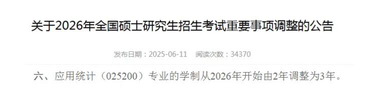 6月11日,中央民族大學(xué)發(fā)布《關(guān)于2026年全國碩士研究生招生考試重要事項調(diào)整的公告》,明確規(guī)定:應(yīng)用統(tǒng)計(025200)專業(yè)的學(xué)制從2026年開始由2年調(diào)整為3年。