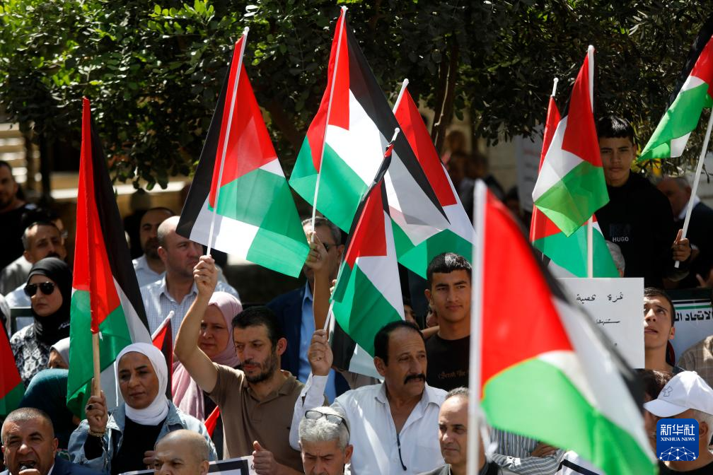 ??9月23日,在約旦河西岸城市希伯倫,民眾揮舞巴勒斯坦旗幟參加慶?;顒?。新華社發(fā)(馬蒙·沃茲沃茲攝)