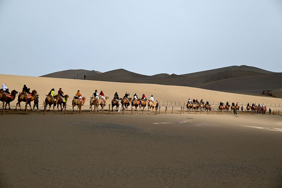 國慶、中秋雙節(jié)將至,節(jié)日氛圍日益濃厚,多地景區(qū)游客增多,旅游逐漸“升溫”。圖為9月25日,游客在甘肅省敦煌市鳴沙山月牙泉景區(qū)游覽。新華社發(fā)(張曉亮攝)