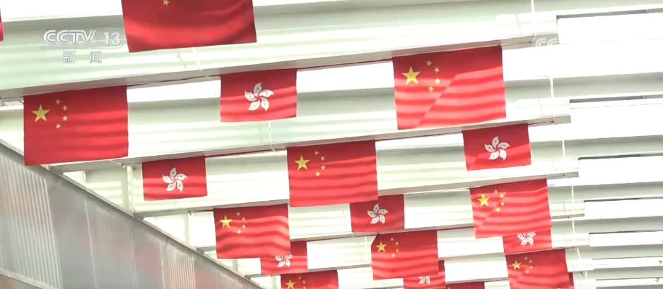 在香港的街頭巷尾,五星紅旗與紫荊花區(qū)旗迎風飄揚,祝福標語和慶祝海報處處可見,節(jié)日氣氛濃郁。