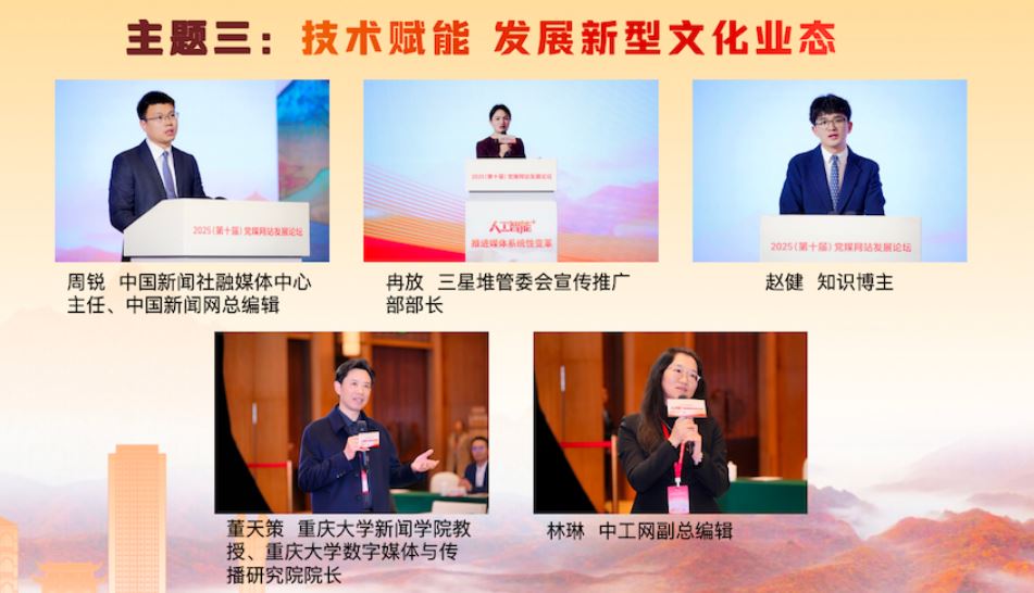在“技術(shù)賦能 發(fā)展新型文化業(yè)態(tài)”主題研討環(huán)節(jié),中國新聞社融媒體中心主任、中國新聞網(wǎng)總編輯周銳,三星堆管委會宣傳推廣部部長冉放,知識博主趙健,分別就技術(shù)賦能中華文化“破圈”出海、三星堆文化傳播數(shù)智實踐、短視頻文化傳播等方面的經(jīng)驗成果進行了精彩展示。重慶大學新聞學院教授、重慶大學數(shù)字媒體與傳播研究院院長董天策,中工網(wǎng)副總編輯林琳作為互動嘉賓進行了點評,期待主流媒體發(fā)揮傳播實踐智慧,在內(nèi)容、技術(shù)和社會責任之間找到平衡,鑄造中華文化新輝煌。