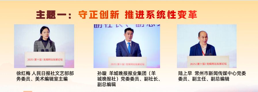 在“守正創(chuàng)新 推進系統(tǒng)性變革”主題研討環(huán)節(jié),人民日報社文藝部部務(wù)委員、美術(shù)編輯室主編徐紅梅,羊城晚報報業(yè)集團(羊城晚報社)黨委委員、副社長、副總編輯孫璇,常州市新聞傳媒中心黨委委員、副主任、副總編輯陸上早分別作主旨發(fā)言,介紹了各自領(lǐng)域推進系統(tǒng)性變革、發(fā)展新時代中國特色社會主義文化的實踐與探索。徐紅梅表示,“每日讀畫”采取“AI+美術(shù)”“微視頻+夜讀”的形式,堅持“讀準、讀細、讀新、讀美”,讓AI成為深入畫境、開啟古今對話的共創(chuàng)者,以動態(tài)轉(zhuǎn)譯、意境擴展、流程再造、視聽融合開發(fā)美術(shù)融媒的敘事潛能,深入挖掘中華文明賡續(xù)傳承的基因密碼,成為探索主流媒體系統(tǒng)性變革的微觀樣本。孫璇表示,羊城晚報全面啟動系統(tǒng)性變革,以做強媒體、文化、數(shù)據(jù)、產(chǎn)業(yè)四個戰(zhàn)略板塊為重點,把“技術(shù)賦能”嵌入系統(tǒng)性變革各關(guān)鍵板塊,積極增強文化傳播、促進文化交流和繁榮文化生產(chǎn)。陸上早表示,常州借“蘇超”東風,走出城市轉(zhuǎn)型與能級躍升之路。改革的推進需聚焦六大方向:組織體系化,內(nèi)容精品化,傳播移動化,技術(shù)現(xiàn)代化,分配績效化,干部年輕化。
