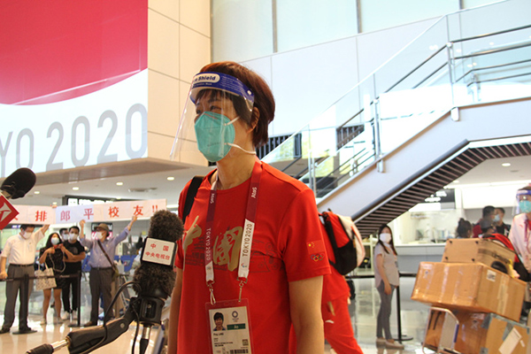 7月19日晚,中國女排主教練郎平在抵達(dá)東京成田機場后接受媒體采訪。李沐航攝