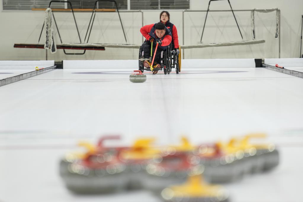 輪椅冰壺運(yùn)動(dòng)員王海濤(前)在國家殘疾人冰上運(yùn)動(dòng)比賽訓(xùn)練館投壺。新華社記者彭子洋攝
