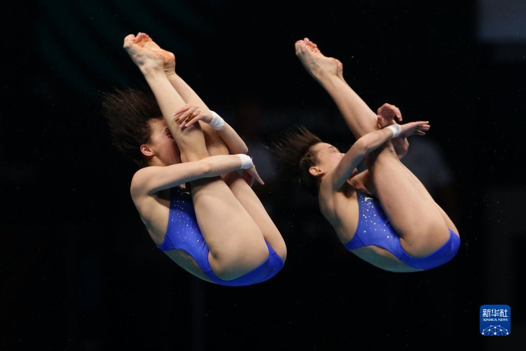 6月30日,陳芋汐(左)/全紅嬋在比賽中。當(dāng)日,在匈牙利布達(dá)佩斯舉行的2022年世界游泳錦標(biāo)賽跳水項(xiàng)目女子雙人10米臺(tái)決賽中,中國(guó)選手陳芋汐/全紅嬋奪得冠軍。新華社記者 鄭煥松 攝