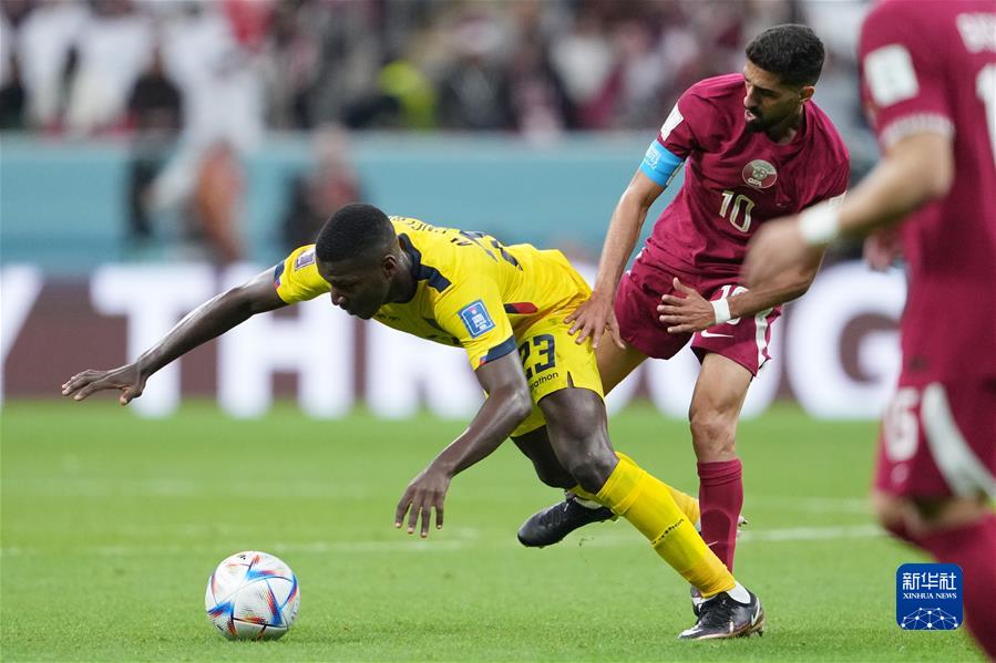 11月20日,厄瓜多爾隊球員赫格森·門德斯(左)與卡塔爾隊球員穆罕默德·蒙塔里在比賽中拼搶。新華社記者 韓巖 攝