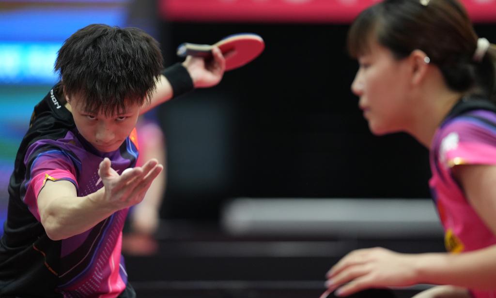 3月27日,王楚欽/孫穎莎(右)在比賽中。新華社記者賈浩成攝