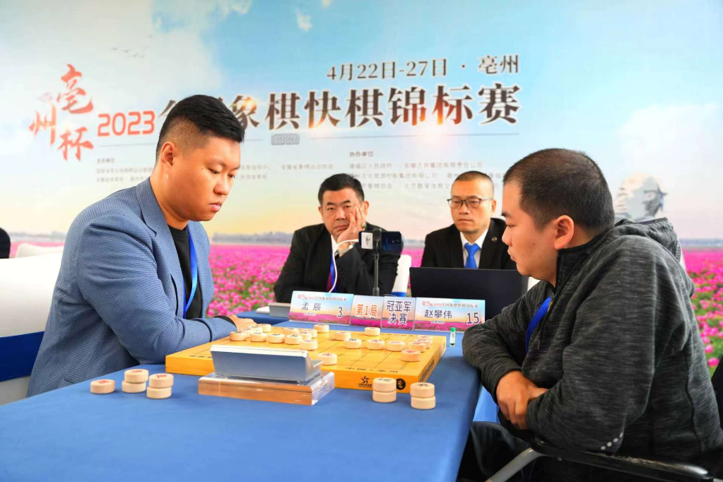 快棋組決賽采用“兩局分先制”,在亳州市華佗百草園景區(qū)進(jìn)行。男子組冠軍爭奪戰(zhàn)第一局由趙攀偉執(zhí)先手,雙方以和棋收?qǐng)?。第二局換先再戰(zhàn),孟辰執(zhí)先手?jǐn)[出“中炮直橫車進(jìn)三兵”開局,趙攀偉應(yīng)以“屏風(fēng)馬進(jìn)三卒”。雙方布局階段便產(chǎn)生激斗,最終孟辰通過步步精準(zhǔn)的進(jìn)攻取得勝利。