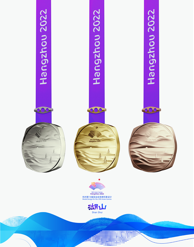 獎(jiǎng)牌取名為“湖山”,它的設(shè)計(jì)靈感源自五千年良渚文明,展示中國江南文化,呈現(xiàn)杭州山水景觀。在亞運(yùn)會(huì)獎(jiǎng)牌設(shè)計(jì)中首次將方形玉琮和圓形獎(jiǎng)?wù)氯跒橐惑w,其中獎(jiǎng)牌正面用凸出的線條勾勒出“三面云山一面城”的杭城畫卷,湖水漣漪,山巒起伏;獎(jiǎng)牌背面,形似方形印章,寓意運(yùn)動(dòng)員們?cè)诤贾輥嗊\(yùn)會(huì)上留下美好的印記。